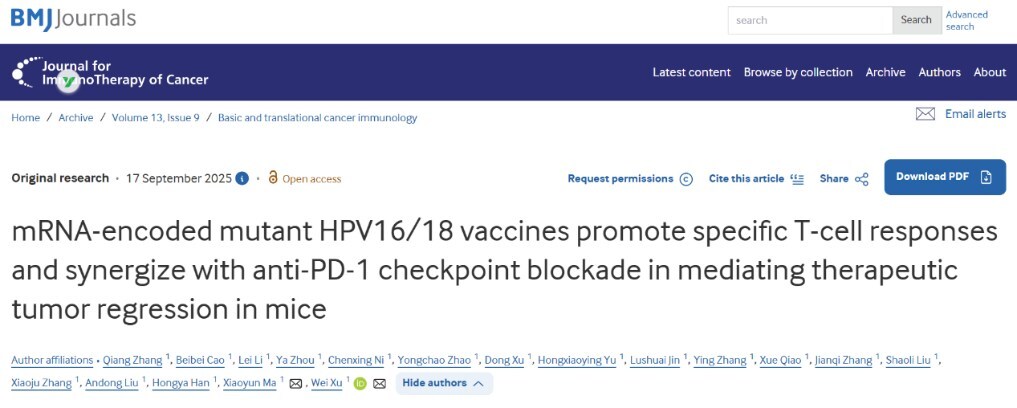 On September 17, JITC published: “mRNA-encoded mutant HPV16/18 vaccines promote specific T-cell responses and synergize with anti-PD-1 checkpoint blockade in mediating therapeutic tumor regression in mice.”