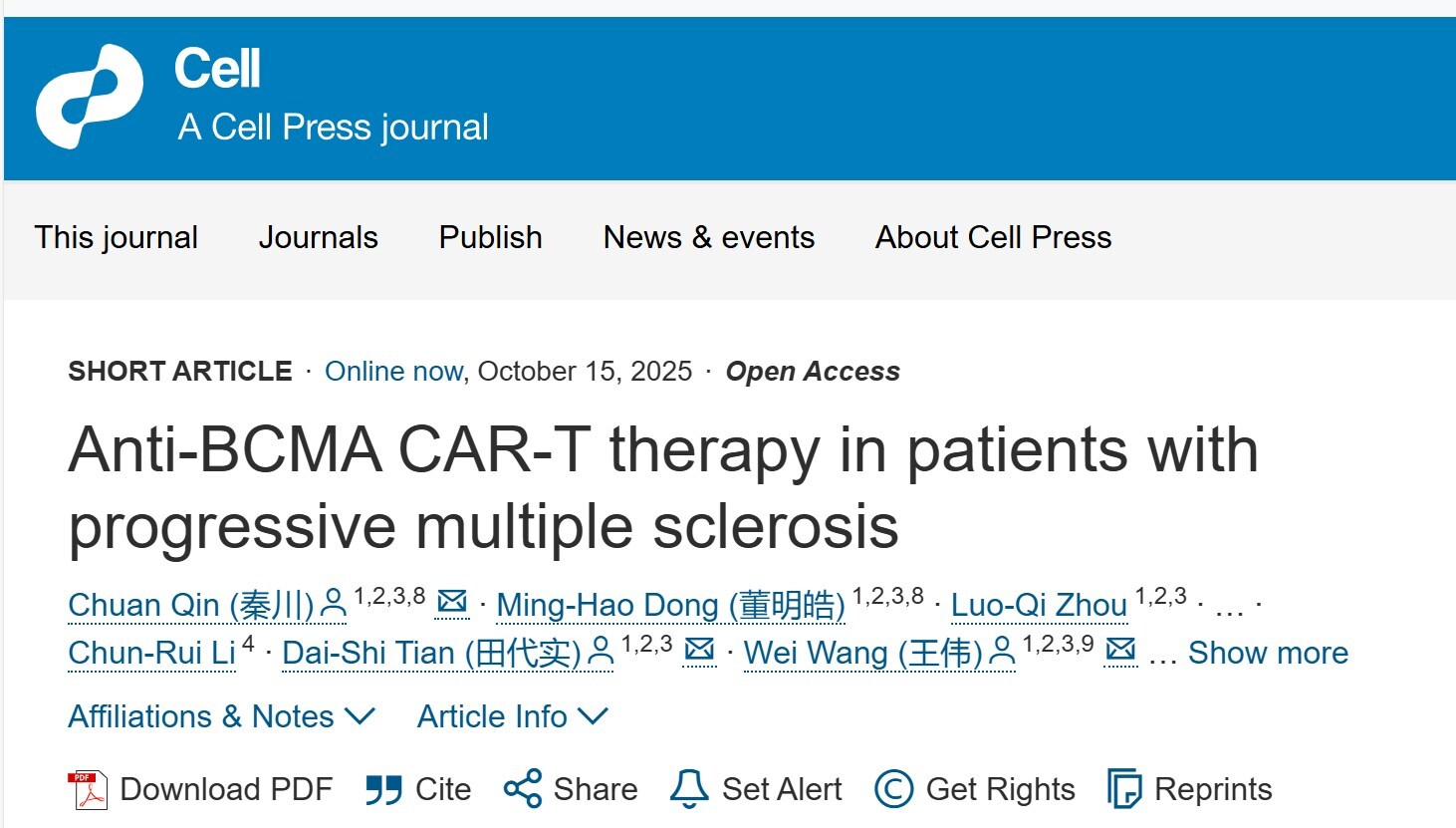 The study entitled ‘Anti-BCMA CAR-T Cells in Progressive Multiple Sclerosis’ has been published in Cell. Full text available at: www.cell.com/cell/fulltext/S0092-8674(25)01088-8. This study is based on an investigator-initiated trial (NCT04561557) led by Professor Wei Wang’s team from the Department of Neurology at Tongji Hospital, Tongji Medical College, Huazhong University of Science and Technology.