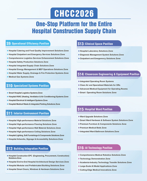 Designed as an immersive, use-case-driven experience, CHCC 2026 is structured around eight themed pavilions, covering areas of operational efficiency, innovation in specialized medical systems, integrated building systems, interior environments, clinical space upgrades, cleanroom engineering, hospital wards, and AI technologies. Within these halls, 40 exhibition zones will cover the end-to-end hospital construction procurement process, spanning hospital planning and design, mechanical and electrical systems, interior finishing, specialized medical engineering solutions, medical equipment, medical robots, digitally enabled hospital operations, and logistics and operations management. Together, they will present thousands of integrated, application-ready solutions shaping the future of modern healthcare infrastructure.