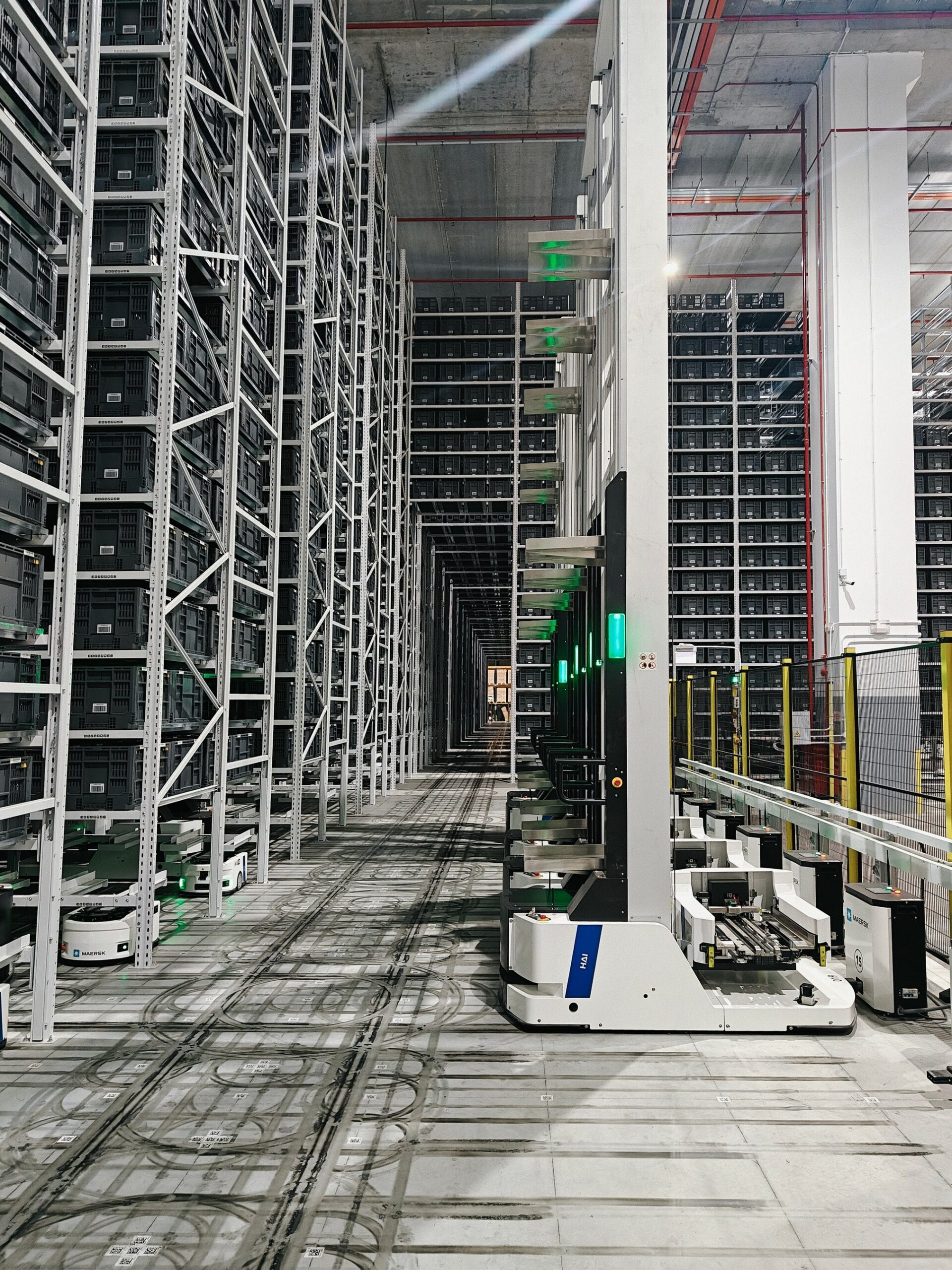 Hai Robotics A42T robots retrieve storage totes from high-density vertical racking, enabling Maersk to maximize storage capacity.
