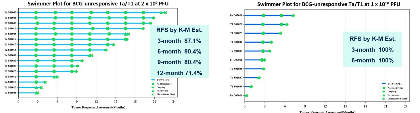 The patients were enrolled and treated with intravesical MVR-T3011 at two dose levels: 2×109 PFU and 1×1010 PFU in this study. There were a total of 26 patients with papillary (16 patients at the dosage level of 2×109 PFU, 10 patients at the dosage level of 1×1010 PFU), and a total of 12 patients with carcinoma in situ (CIS) (7 patients at the dosage level of 2×109 PFU, 5 patients at the dosage level of 1×1010 PFU) enrolled in this trial. Data from the patients demonstrated a promising efficacy profile: