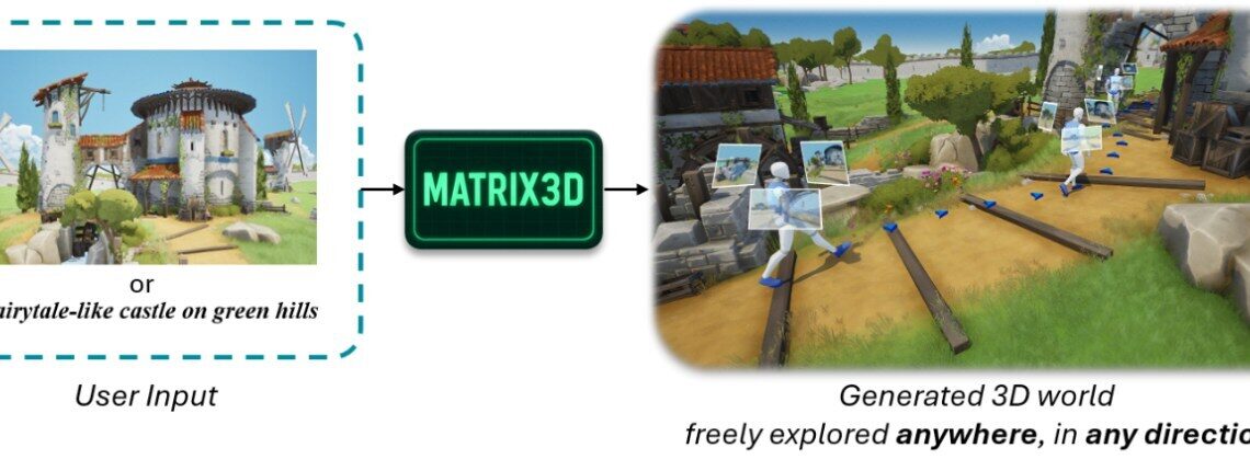 By integrating panoramic representation, conditional video generation, and 3D reconstruction modules, Matrix-3D surpasses existing methods in field-of-view range, geometric consistency, and visual quality. It accepts both text and image inputs and generates freely explorable 3D scenes.