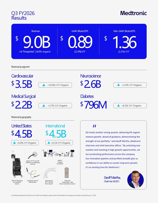 GALWAY, Ireland, Feb. 17, 2026 /PRNewswire/ — Medtronic plc (NYSE: MDT), a global leader in healthcare technology, today announced financial results for its third quarter (Q3) of fiscal year 2026 (FY26), which ended January 23, 2026.
