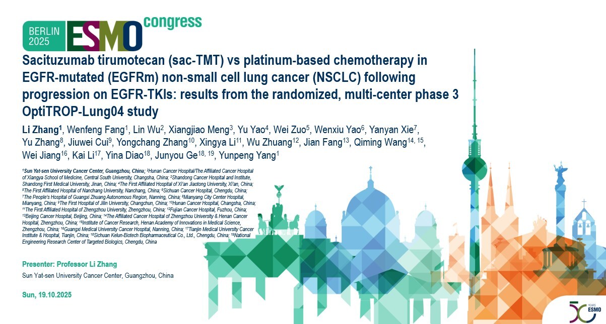 CHENGDU, China, Oct. 20, 2025 /PRNewswire/ — Sichuan Kelun-Biotech Biopharmaceutical Co., Ltd. (the “Company”) announced that at the 2025 European Society for Medical Oncology (ESMO) Congress held in Berlin, Germany, results from a Phase 3 OptiTROP-Lung04 trial of the Company’s trophoblast cell-surface antigen 2 (TROP2)-directed antibody-drug conjugate (ADC) sacituzumab tirumotecan (sac-TMT) in EGFR-mutated non-small cell lung cancer (NSCLC) following progression on epidermal growth factor receptor-tyrosine kinase inhibitors (EGFR-TKIs) was presented as an oral report by Professor Li Zhang from Sun Yat-sen University Cancer Center (Presentation # LBA5, Presidential Symposium II) and were simultaneously published in the New England Journal of Medicine (Impact Factor = 78.5).