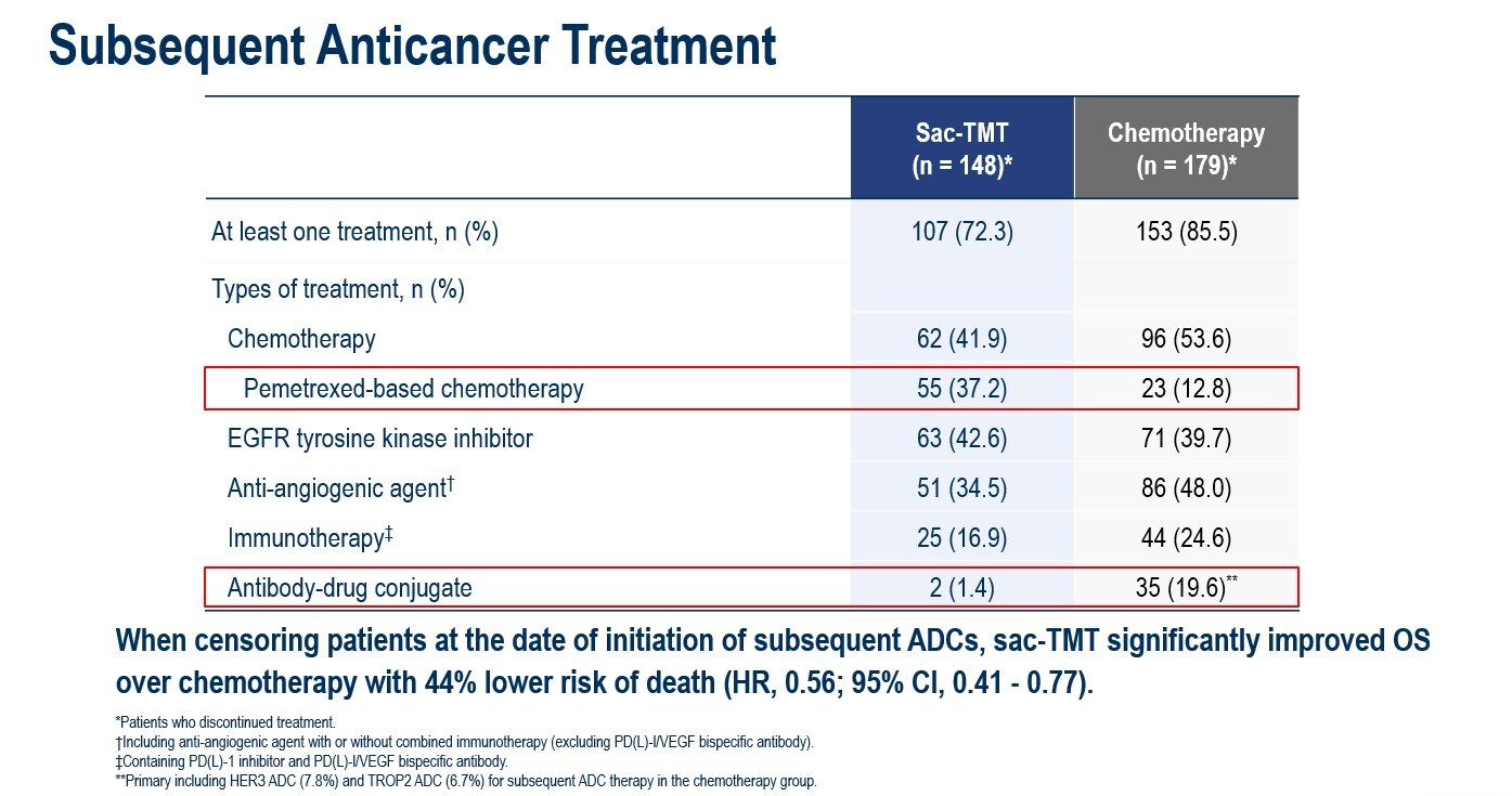 At the preplanned interim analysis of overall survival (OS), the OS was not reached (NR) in the sac-TMT group and 17.4 months in the chemotherapy group. sac-TMT significantly improved OS over chemotherapy with 40% lower risk of death (hazard ratio (HR) 0.6; 95% CI: 0.44-0.82; two-sided P=0.001). In the supplemental analysis, when censoring patients at the date of initiation of subsequent ADCs, sac-TMT significantly improved OS over chemotherapy with 44% lower risk of death (HR, 0.56; 95% CI, 0.41 – 0.77).