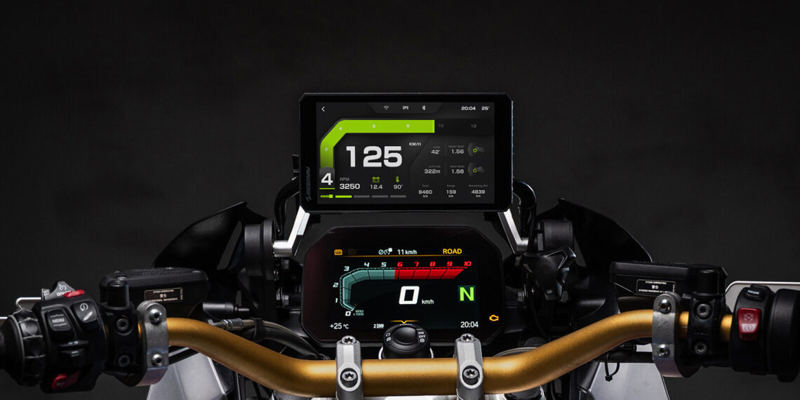 The 1200-nit screen is sunlight-readable. Built to IP69K, it’s ready for all-weather riding.
