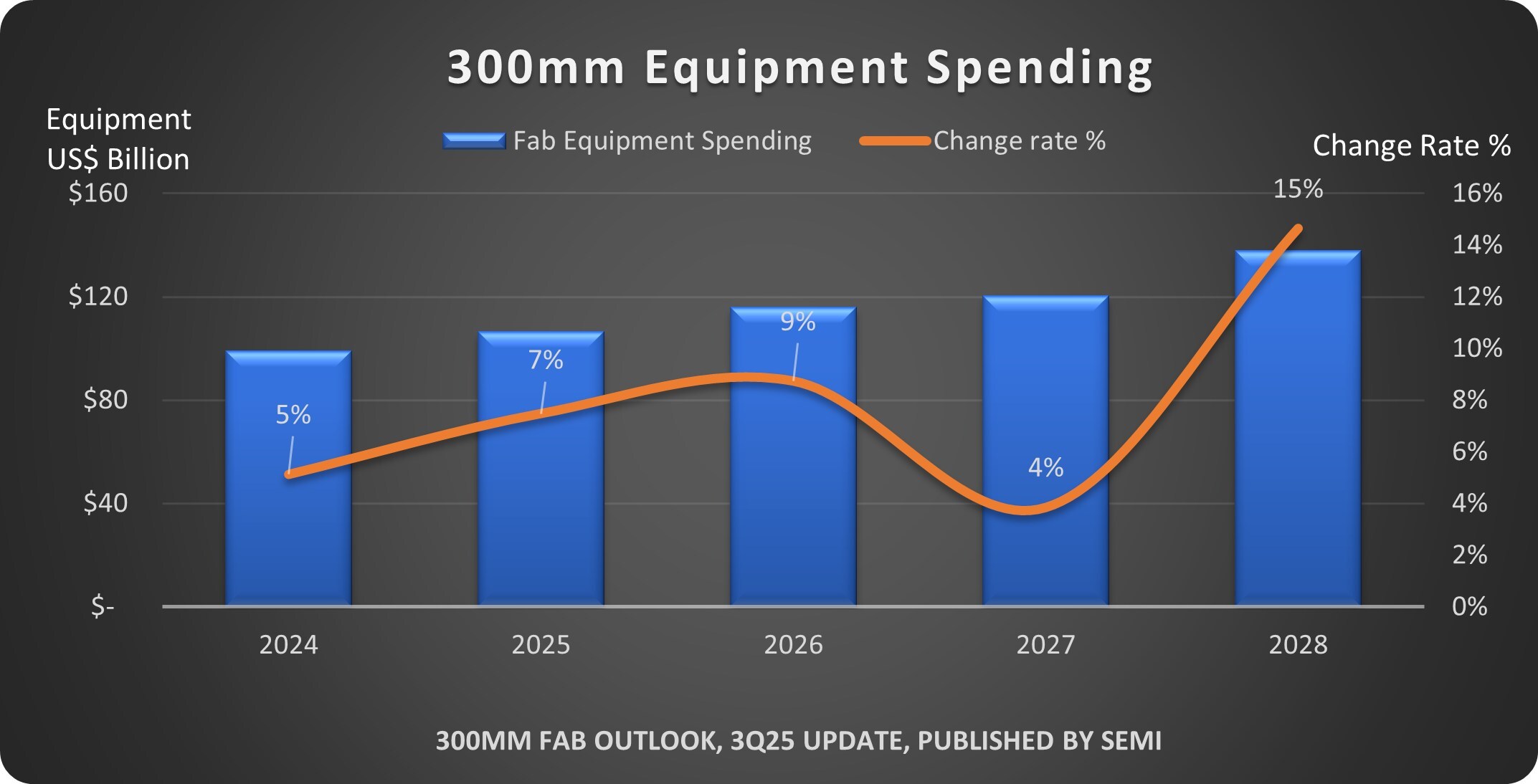 Worldwide 300mm fab equipment spending is expected to surpass $100 billion for the first time in 2025, growing 7% to $107 billion. The report projects investment will increase 9% to $116 billion in 2026, 4% to $120 billion in 2027, and 15% to $138 billion in 2028.