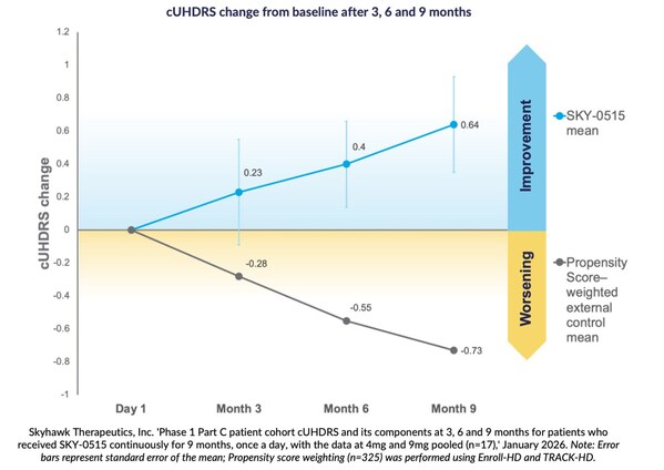 Skyhawk Therapeutics, Inc. ‘Phase 1 Part C patient cohort cUHDRS and its components at 3, 6 and 9 months for patients who received SKY-0515 continuously for 9 months, once a day, with the data at 4mg and 9mg pooled (n=17),’ January 2026. Note: Error bars represent standard error of the mean; Propensity score weighting (n=325) was performed using Enroll-HD and TRACK-HD.