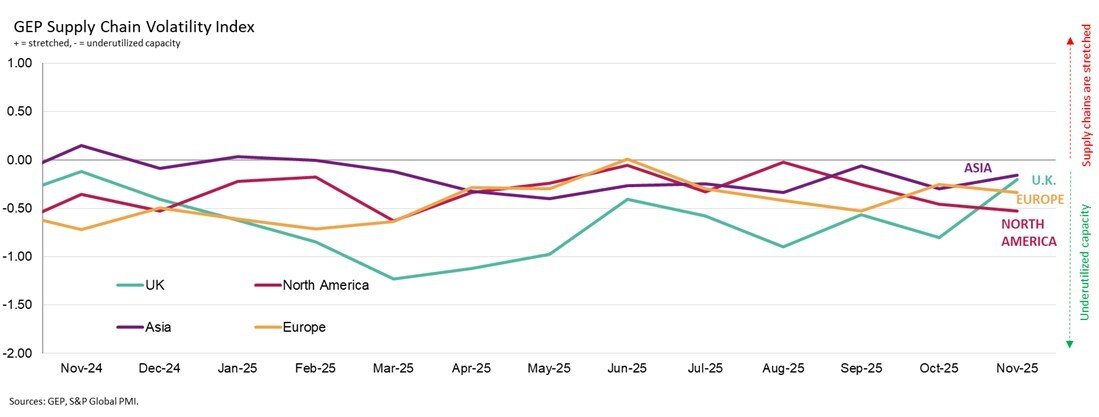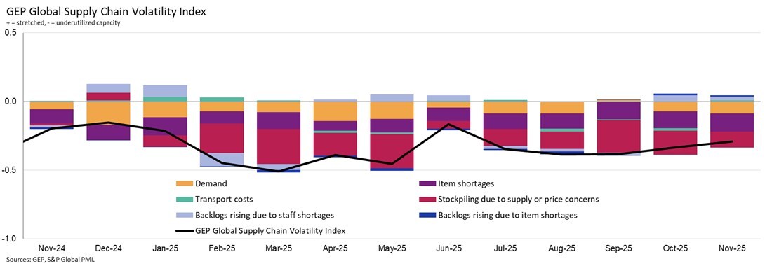 CLARK, N.J., Dec. 10, 2025 /PRNewswire/ — GEP Global Supply Chain Volatility Index, a leading economic indicator based on a monthly survey of 27,000 businesses, shows that global supply chains remained underutilized in November, with manufacturers continuing to limit purchasing, signaling a weakening outlook for the start of 2026.
