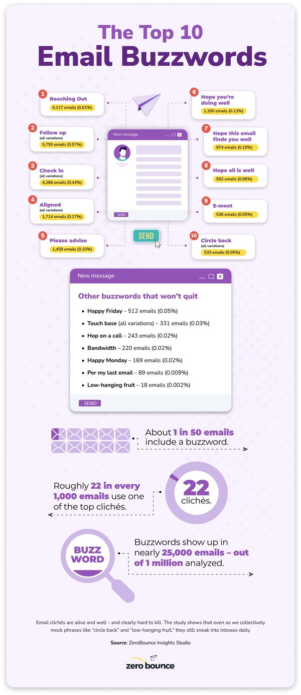 SANTA BARBARA, Calif., Jan. 21, 2026 /PRNewswire/ — “Reaching out” is the most overused email cliché, with “checking in” and “follow up” close behind, according to a new study by ZeroBounce. Phrases like “please advise” and “hope my email finds you well” are still prevalent in corporate communication, even as AI tools become more common in everyday writing.