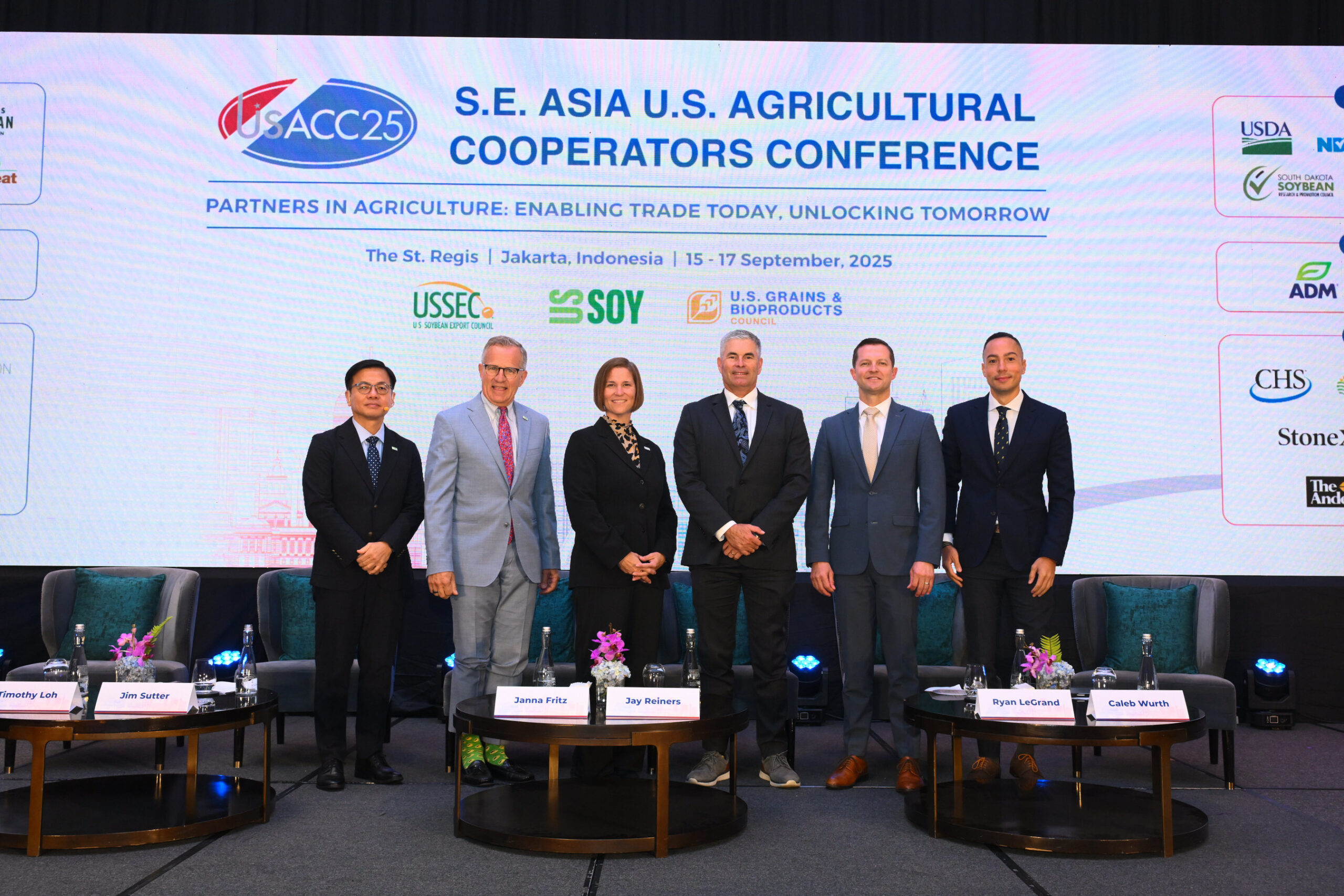 Leaders from the U.S. Soybean Export Council (USSEC) and U.S. Grains & BioProducts Council, in a panel discussion at the S.E. Asia U.S. Agricultural Cooperators Conference, held in Jakarta, Indonesia, 15–17 September 2025. The conference highlighted collaboration in agriculture under the theme ‘Partners in Agriculture: Enabling Trade Today, Unlocking Tomorrow.’